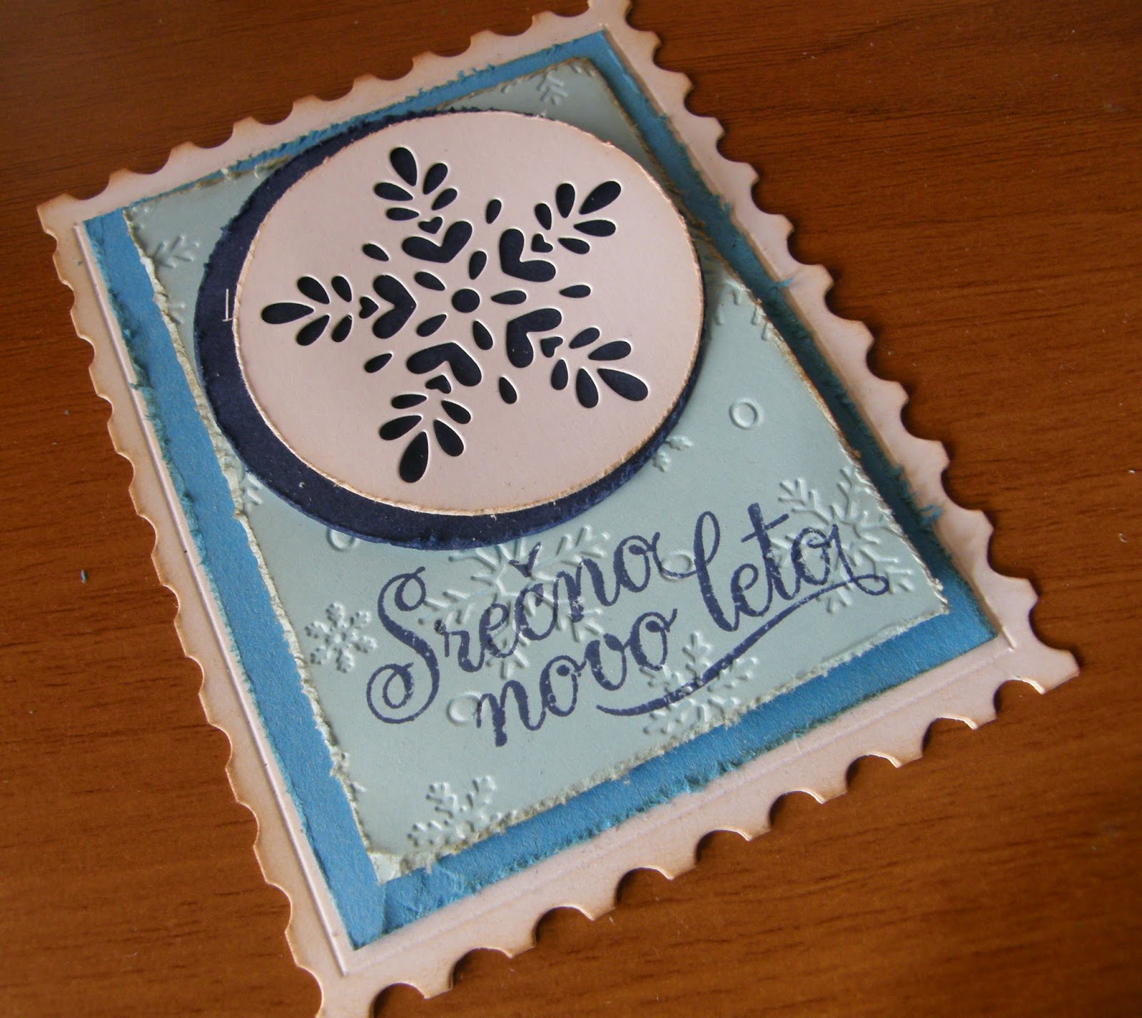 Osnovo voščilnice sem izbrala v natur barvi, nato sem iz belega paprija izrezala nekaj milimetrov manjši pravokotnik. S pomočjo kotnega luknjača sem osnovi in belemu papirju zaoblila robove. Pod rokami se mi je motal košček akvarelnega papirja in po glavi so se začele preskakovati ustvarjalne iskre. Vzela sem zbrani napis, ki sem ga s pomočjo Versa Mark blazinive odtisnila na sredino akvarelnega papirja in ga embosirala z belim embosing prahom. Ker belo na belo ni nič visedi sem se odločila, da bom zadevo nekako pobarvala. Pred samim barvanjem, pa sem želela našemu napisu dodati nekaj posebnega. Pobrskala sem po moji zbirki mapic/srajčk za embosiranje in izbrala snežinke, med brskanjem pa sem naletela na tole